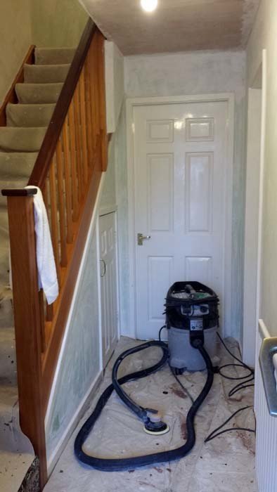 The Festool or Mirka sander is then used to sand the walls and the dust is extracted. The end result is a smooth finish where I have resurfaced the walls and very importantly without covering the house in a fog like dust like hand sanding would of caused.
